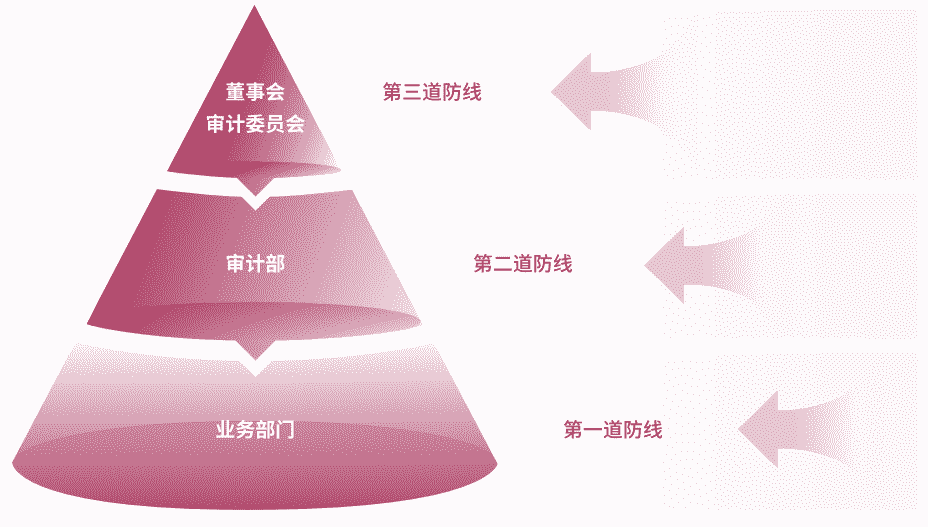为有效防范贿赂与贪污等商业道德风险,,,,公司建立了由“董事会审计委员会、、、、审计部、、、、业务部门”组成的三道防线,,,,全面落实公司商业道德合规工作,,,并确保《商业道德行为准则》的有效执行。。。公司审计部在董事会审计委员会的指导下定期评估、、、审查公司的合规运营情况及准则的履行情况,,,,并对公司及所有子公司开展商业道德行为审计。。。。公司保证商业道德行为准则审计工作每三年覆盖公司及其所有控股子公司的全部业务范围。。。。