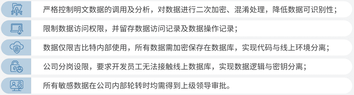 公司对用户个人信息实施脱敏处理,,严格限制用户信息用途,,,数据使用完成后集中归档处理。。。为进一步确保数据处理过程的安全,,公司根据实际的业务工作分岗设限,,最大程度保护数据隐私安全,,,,如在生产网络中的加密数据由研发部门员工负责编写加、、、、解密程序,,但其无法直接访问到加密后的数据库;程序的加、、、解密密钥由运维员工单独配置。。。。