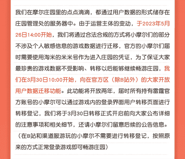 合作结束本就是开发方和代理方双方的事情,,,降低这件事情对玩家的影响,,才是对所有珍视这段童年的摩尔玩家最好的呵护。。。目前看来,,用户完全不用担心后续因无法登录游戏而造成任何数据上的损失,,,只要及时进行账号转移,,,就可以好好保留、、、延续在庄园的痕迹和回忆,,,,继续在庄园里做快乐的红鼻子小鼹鼠。。。。
