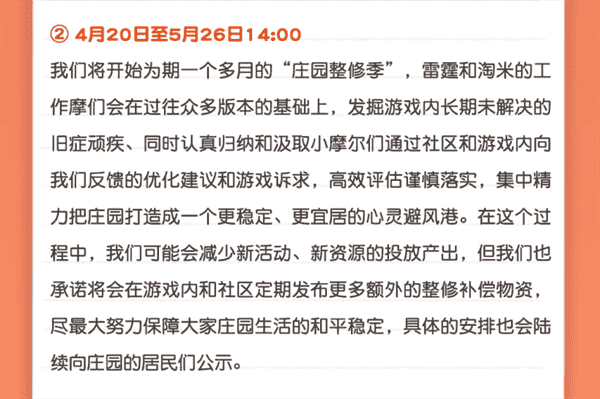 合作的结束并不意味着这个童年IP的结束,,,,对于《摩尔庄园》手游而言,,,这是一个新阶段的开始。。后续游戏内将开启庄园重构计划,,会就以往遗留下来的BUG进行集中修复,,并在游戏内和社区定期发布更多补偿物资。。。