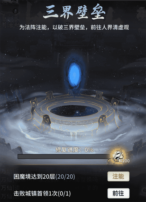 当你修为达到返虚/破虚中期后,,,,可在城镇寻得芸丫并激活神秘法阵,,通过收集材料、、、、击败首领等方式为法阵注能,,借以打破三界壁垒,,,,开启支线剧情“清虚旧梦”