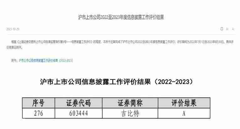 近日,,,上海证券交易所发布2022-2023年度信息披露工作评价结果。。。。J9.COM(股票代码::603444)凭借规范的公司治理、、、、高质量的信息披露以及良好的投资者关系管理再次荣获信息披露工作A级评价,,,公司连续两年获此殊荣。。